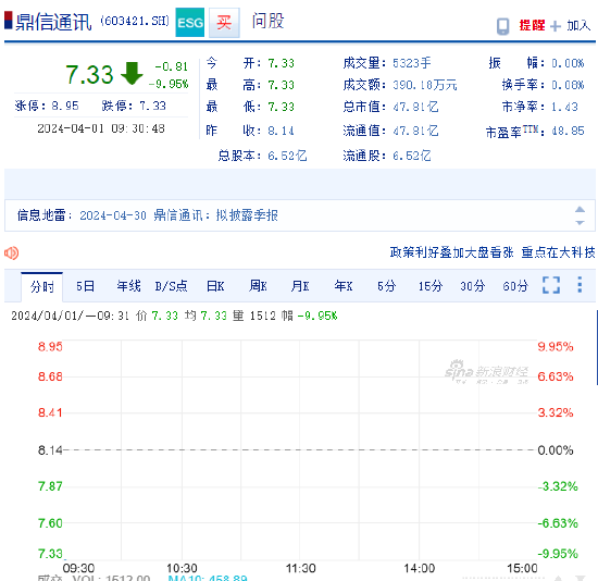 4月1日开盘,鼎信通讯一字跌停,股价报7.33元/股,总市值47.81亿元。