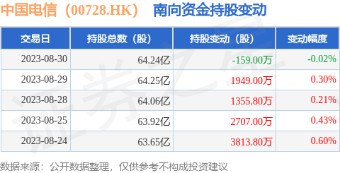 中国电信(00728.HK):8月30日南向资金减持159万股