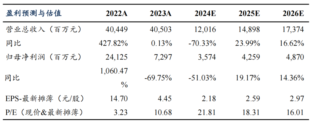 盈利预测与投资评级:我们基本维持2024-2025年盈利预测,新增2026年盈利预测,预计2024-2026年公司归母净利润35.7/42.6/48.7亿元,同比-51%/+19%/+14%,对应24-26年22x/18x/16x PE,维持“买入”评级。