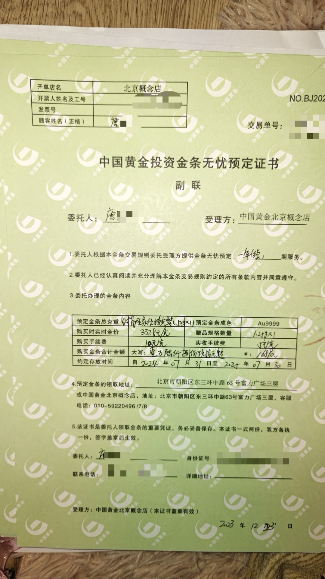 从唐先生提供的一份“中国黄金投资金条无忧预定证书”上,记者看到,该交易受理方为中国黄金北京概念店,双方约定该服务为一年期,唐先生称,根据协议,购买者可获得一个1.25g的黄金赠品,此后每次续约时都可以获得一次同样的赠品。唐先生表示,去年年底发现该店关闭后,意识到可能无法兑换所购金条,其立即选择了报警。