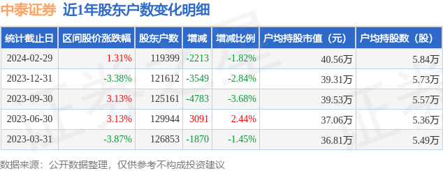 从股价来看,2023年12月31日至2024年2月29日,中泰证券区间涨幅为1.31%,在此期间股东户数减少2213.0户,减幅为1.82%。