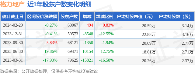 从股价来看,2023年12月31日至2024年2月29日,格力地产区间跌幅为9.27%,在此期间股东户数增加494.0户,增幅为0.83%。