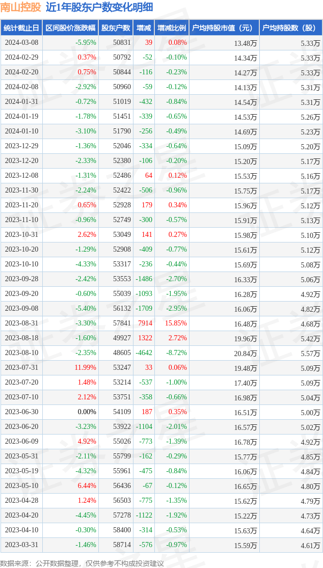 从股价来看,2024年2月29日至2024年3月8日,南山控股区间跌幅为5.95%,在此期间股东户数增加39.0户,增幅为0.08%。