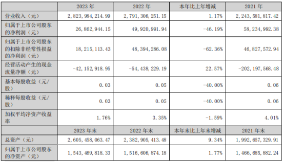 2023年,公司实现营业收入2,823,984,214.99元,同比增长1.17%;营业成本2,657,468,941.14元,同比增长2.47%;归属于上市公司股东的净利润为26,862,944.15元,同比下降了46.19%。报告期内,公司营业收入稳健,略有增长,但利润出现下降,原因主要是受房地产行业影响,行业产能过剩,市场竞争加剧,公司各类型材加工费及铝模板租赁费均有不同程度下降,以致公司利润下降较大。