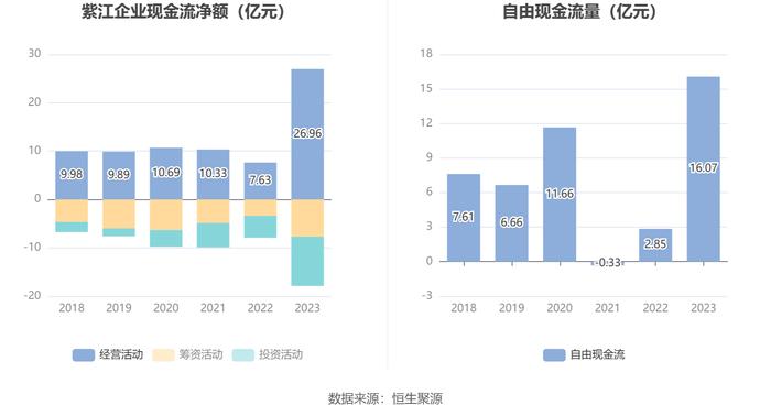 2023年,公司经营活动现金流净额为26.96亿元,同比增长253.34%;筹资活动现金流净额-7.68亿元,同比减少4.32亿元;投资活动现金流净额-10.20亿元,上年同期为-4.53亿元。