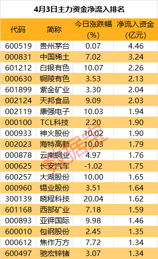 贵州茅台主力资金净流入4.46亿元,居首位。消息面上,4月2日晚间,贵州茅台发布2023年年报,公司营业总收入1505.60亿元,同比增长18.04%,利润总额1036.63亿元,同比增长18.20%,首次达成营收和利润“双千亿”目标。