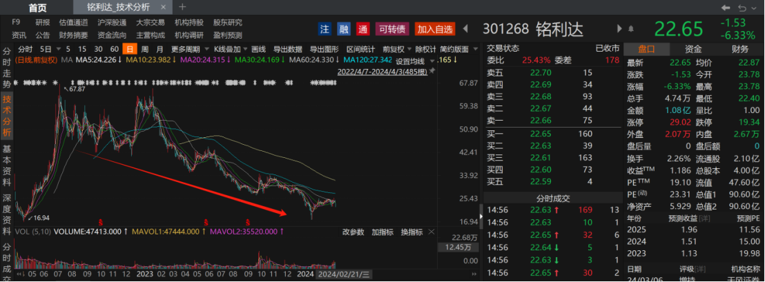 在严管背景下,铭利达实控人夫妻离婚也引起诸多关注。公告次日,铭利达今日低开低走,截至收盘报22.65元/股,跌幅6.33%,低于2022年IPO时的发行价28.5元/股。拉长时间来看,铭利达较其上市初期67.87元的历史最高价迄今股价累计最大跌幅为75%。据铭利达公告,经协商,陶诚拟将其直接持有的公司约1087.49万股股票分割过户给卢萍芳女士,并拟将持有的达磊投资41.44%的股权(间接对应公司约6336.48万股股票)分割过户给卢萍芳。本次权益变动后,陶诚不再直接持有铭利达股票,合计间接持有公司约1.05亿股股票,占公司总股本的26.36%。卢萍芳通过直接和间接的方式合计持有约8188.43万股,占公司总股本的20.47%。