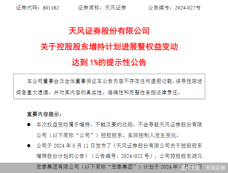 6月11日至7月1日期间,宏泰集团已通过上海证券交易所交易系统在二级市场累计增持天风证券股份8670.92万股,占天风证券股份总数的1%。