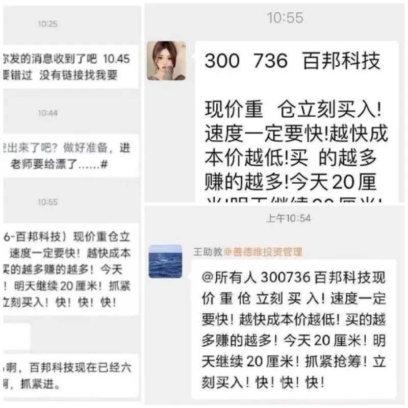 此后,有股民在社交网络晒出了一些截图,引发“杀猪盘”质疑。相关截图内容显示,有多个股票群内“老师”在百邦科技股价闪崩前三分钟集中推荐该股票,并鼓励群友买入。