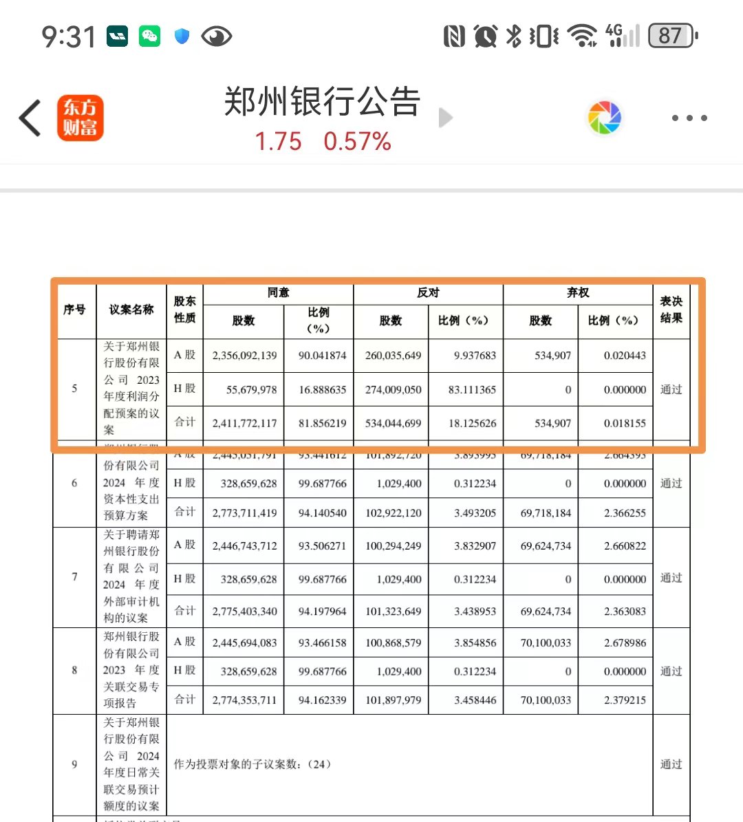 6月27日晚间,郑州银行就2023年度股东周年大会决议发布了公告。值得注意的是,郑州银行2023 年度利润分配预案的议案遭遇参会的83.111365%H股股东反对,但最终仍顺利通过。