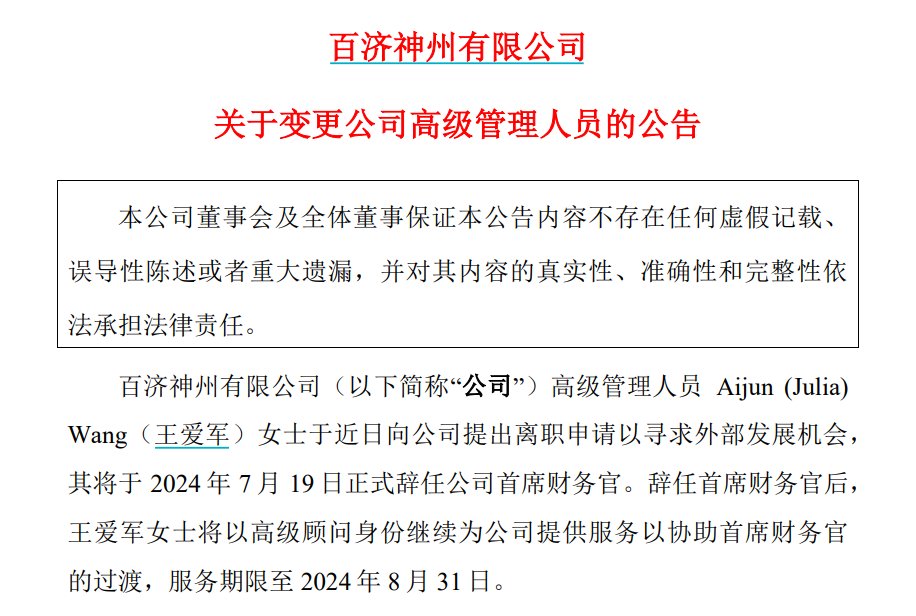 7月18日晚间,百济神州公告称,高级管理人员王爱军(女士)于近日向公司提出离职申请,其将于2024年7月19日正式辞任公司首席财务官。辞任首席财务官后,王爱军将以高级顾问身份继续为公司提供服务以协助首席财务官的过渡,服务期限至2024年8月31日。