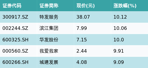 南方财经7月1日电,南财金融终端显示,今日房地产开发主题走强,截至午间收盘(下同)上涨3.95%。持有房地产开发主题股票的中证上海国企ETF(510810)早盘上涨0.29%,最新价报0.7元。截至上个交易日(6月30日),该基金近五个交易日净值(复权单位净值,下同)下跌1.58%,近一个月净值下跌6.06%。该基金自(20160728)成立以来净值增长率为-25.34%,管理人为汇添富基金管理股份有限公司,基金经理为吴振翔。截至午间收盘,房地产开发主题涨跌幅最高的五只股票为:特发服务(300917.SZ)、滨江集团(002244.SZ)、华发股份(600325.SH)、我爱我家(000560.SZ)与城建发展(600266.SH)。详情见下表: