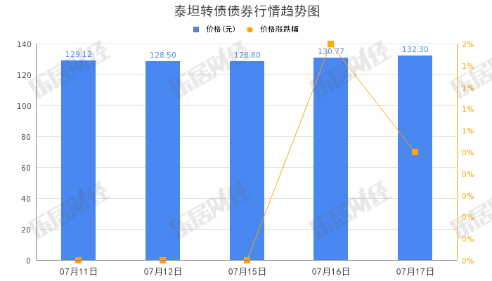 乐居财经 07月18日,“泰坦转债”(127096)早盘拉高,截至11:12,涨幅11.13%,报147.03元。总成交量164.80万手,成交额23.73亿元。