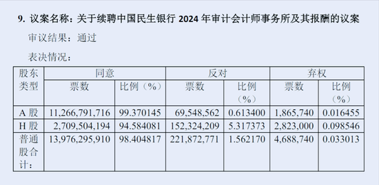 6月26日,民生银行召开股东大会。据决议公告披露,该行已审议通过了续聘2024年审计会计师事务所及其报酬的议案。表决情况显示,续聘议案A股反对票占比0.61%,H股反对票占比5.32%,普通股反对票合计占比4.56%,最终以98.40%的赞成票通过该议案。