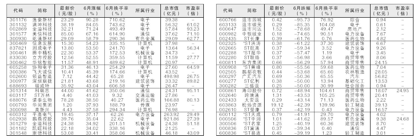 6月两市牛熊股TOP25 逸豪新材涨幅第一