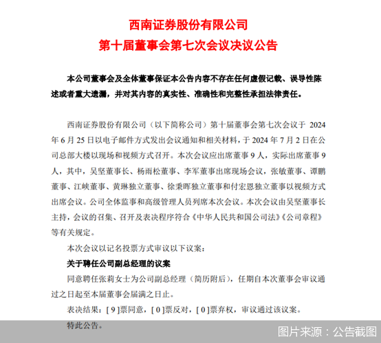 北京商报讯(记者 李海媛)7月2日,西南证券发布公告称,公司董事会同意聘任张莉为公司副总经理,任期自董事会审议通过之日起至本届董事会届满之日止。