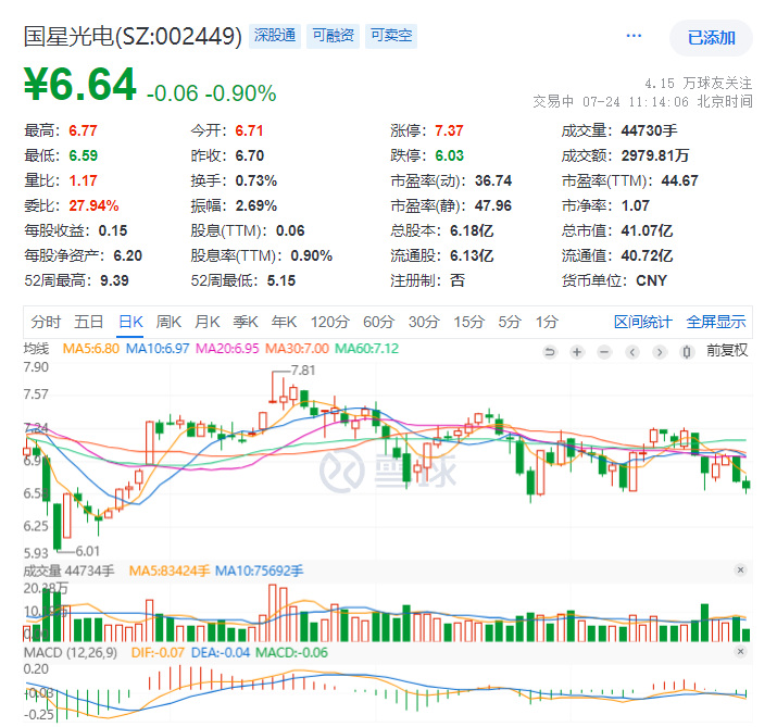 截至7月24日11:14,国星光电股价跌0.9%,报6.64元,总市值为41.07亿元。