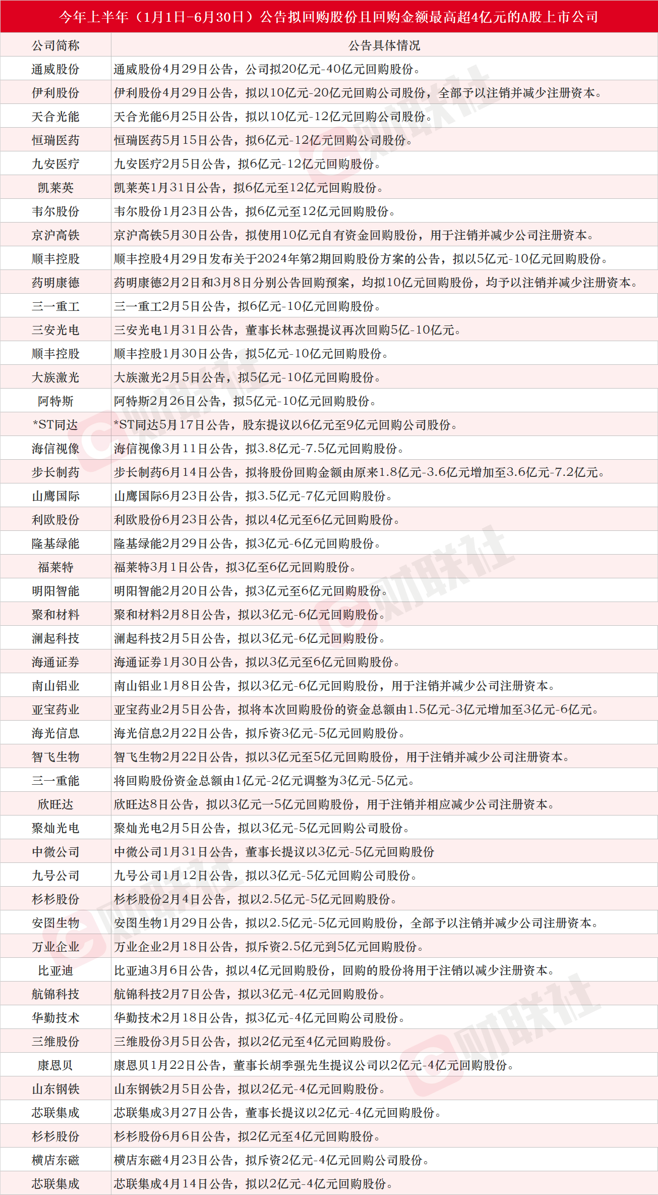 财联社6月30日讯(编辑 宣林)2024年上半年A股回购热潮涌动,据财联社不完全统计,包括九安医疗、凯莱英、韦尔股份、药明康德、三一重工、三安光电、顺丰控股、大族激光、阿特斯、海信视像、隆基绿能、福莱特、明阳智能、聚和材料、澜起科技、海通证券、南山铝业、亚宝药业、海光信息、智飞生物、三一重能、欣旺达、聚灿光电、中微公司、九号公司、杉杉股份、安图生物、万业企业、比亚迪、航锦科技、华勤技术、三维股份、康恩贝、山东钢铁、芯联集成在内的48家上市公司公告拟回购股份且回购金额最高超4亿元,具体情况如下图: