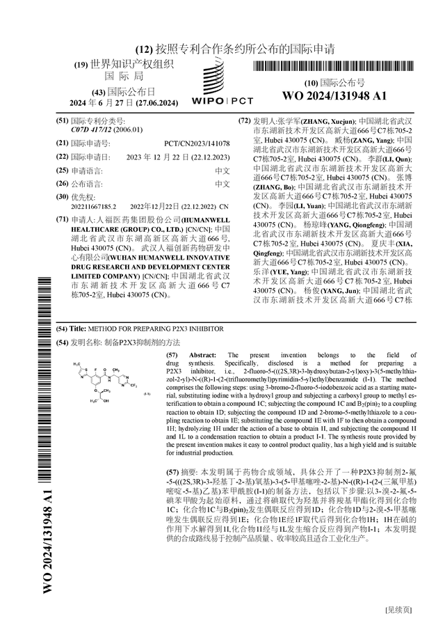 人福医药公布国际专利申请:“制备P2X3抑制剂的方法”