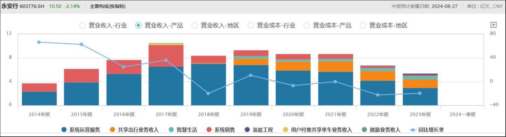 尽管永安行氢能业务规模增长较快,但其基数相对较小,短期内对收入及利润补充有限。财报显示,2023年,公司氢能产品销售及服务收入为2144.62万元,占总营收的比例为3.93%。