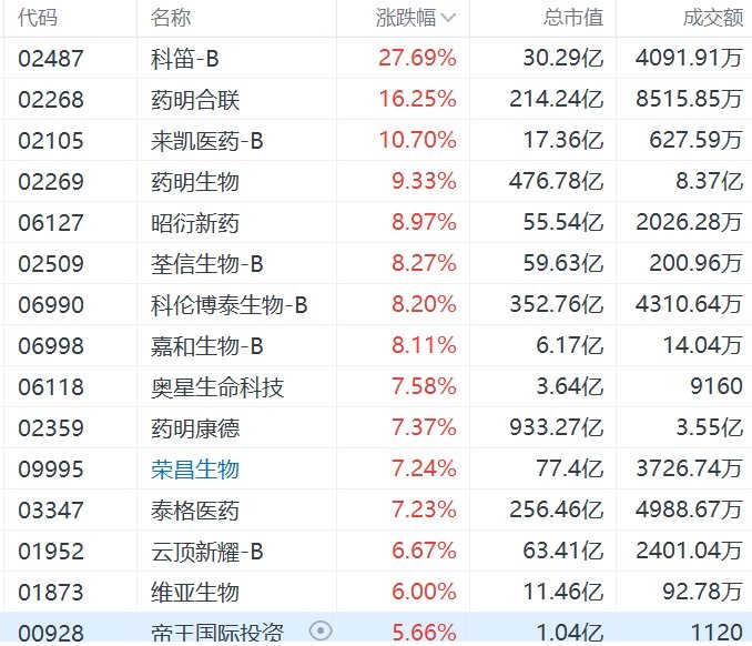 港股生物科技股集体爆发:药明生物涨超9%,药明康德涨超7%