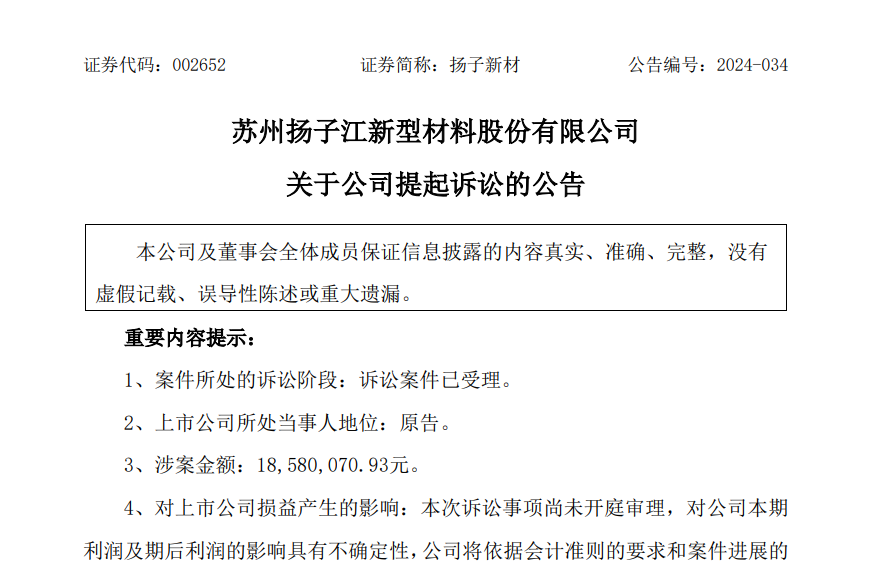 乐居财经 李兰 7月31日,扬子新材(002652.SZ)发布关于公司提起诉讼的公告,涉案金额1858万元,案号为(2024)苏05民初915号。