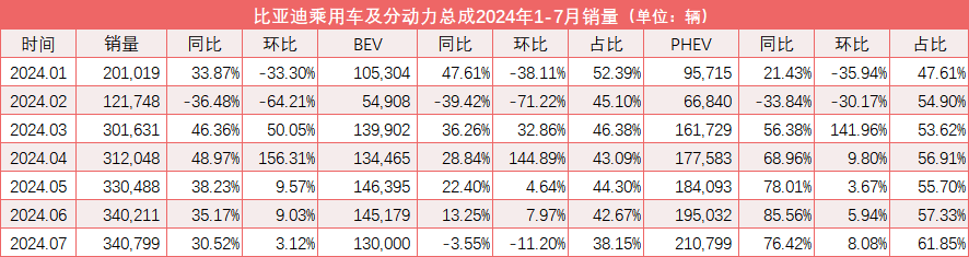 财联社8月2日讯(记者 徐昊)8月1日,比亚迪公布7月产销快报显示,7月销量342,383辆。其中,乘用车销量340,799辆,同比增长30.5%;1-7月,累计销量1,947,944,同比增长29.1%。