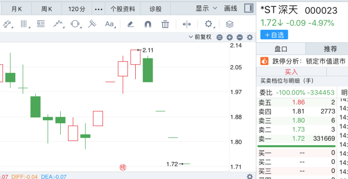 *ST深天(000023.SZ),2024年6月27日至7月24日刚好连续20个交易日收盘市值均低于3亿元,7月24日收盘时的总市值为2.39亿元。这也意味着,*ST深天已然触发了“市值退市”。盘面看,市场已然放弃“治疗”,7月22日至24日三天连续“一字跌停”。
