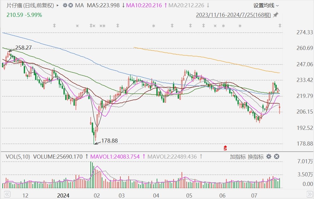 格隆汇7月25日|片仔癀(600436.SH)今日跳空下跌,盘中一度跌8.5%至204.93元。