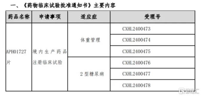 以一品红最新获批临床的口服小分子GLP-1R激动剂为例,据公告披露,APH01727片是一品红药业自主研发的一款高活性高选择性的胰高血糖素样肽-1受体激动剂(GLP-1RA),目标成为每天给药一次的口服小分子GLP-1R激动剂,拟用于2型糖尿病、超重/肥胖患者的治疗。