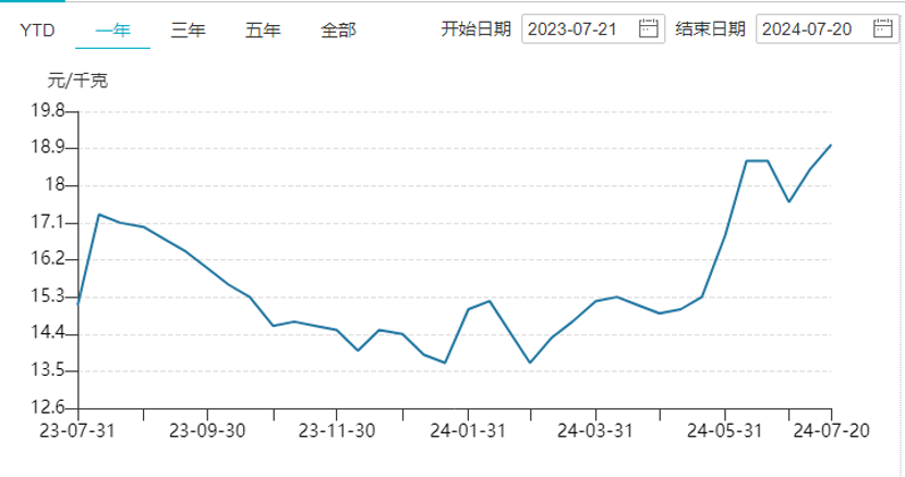 生猪价格上涨仍在继续。中国养猪网数据显示,7月28日,生猪(外三元)价格为19.28元/公斤,同比增长25.19%,环比增长9.79%;生猪(内三元)价格为19.01元/公斤,同比增长24.41%,环比增长7.95%。