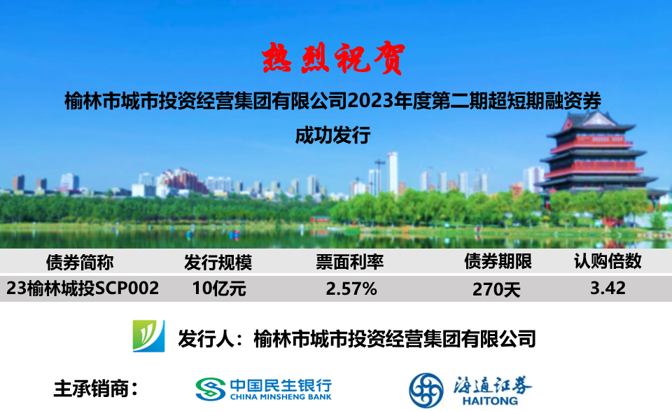 近日,海通证券作为主承销商,助力榆林市城市投资经营集团有限公司(以下简称榆林城投)成功发行2023年度第二期超短期融资券,发行规模10亿元,期限270天,票面利率2.57%,募集资金用于偿还到期的债务融资工具。此次发行获得投资人踊跃认购,认购倍数达3.42倍,体现了投资者对榆林城投的高度关注和认可。