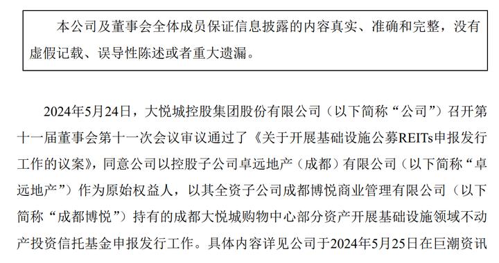 大悦城控股集团股份有限公司表示,将积极推动华夏大悦城基础设施公募REITs发行相关工作,并根据进展情况,严格按照法律法规要求及时履行信息披露义务,请广大投资者注意投资风险。