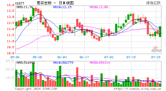 2024年07月31日临近午盘11时30分,君实生物(01877.hk)股票出现异动,股价急速拉升5.13%。截至发稿,该股报12.280港元/股,成交量30.239万股,换手率0.14%,振幅7.53%。