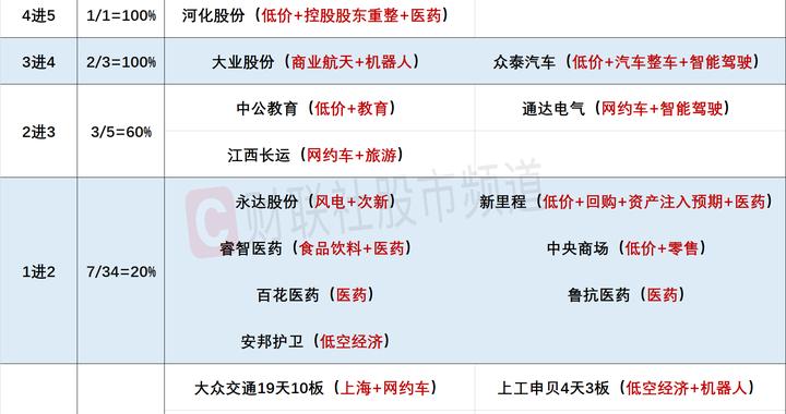 【8月5日连板股分析:腾达科技11连板 大消费板块逆势走强】今日共46股涨停,连板股总数14只,其中三连板及以上个股7只,上一交易日共13只连板股,连板股晋级率53.84%(不含ST股、退市股及未开板新股)。个股方面,全市场超4700只个股下跌,低价股继续走强,今日46只涨停股中有35只股价不足10元,低价股中涌现出一批如众泰汽车、中公教育、河化股份的强势连板股。高位人气股进入“淘汰赛阶段”,人气最强的腾达科技11连板,大众交通19天10板,而启明信息、山子高科则尾盘跌停,此外江铃汽车二连跌停,表明连板风格的赚钱难度激增。板块方面,教育、旅游、白酒等大消费板块早盘走强,消息面上,国务院日前印发《关于促进服务消费高质量发展的意见》,提出6方面20项重点任务;算力、消费电子、资源等受外围影响较大的板块领跌,中际旭创、工业富联、立讯精密等权重跌超7%,中石油、中海油双双跌近5%。