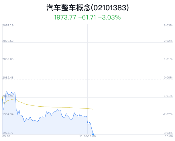 08月05日,汽车整车概念盘中跳水,截至13点09分,汽车整车概念整体指数下跌3.03%,报1973.770点。