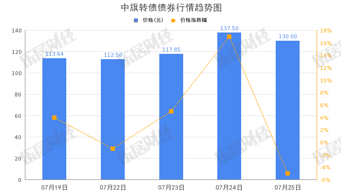 乐居财经 07月26日,“中旗转债”(127081)早盘拉低,截至10:12,跌幅10.57%,报116.26元。总成交量50.79万手,成交额6.02亿元。