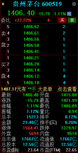 7月29日消息,贵州茅台午后短线跳水跌超1%,跌破7月9日低点,股价逼近1400元,成交额21.49亿元。