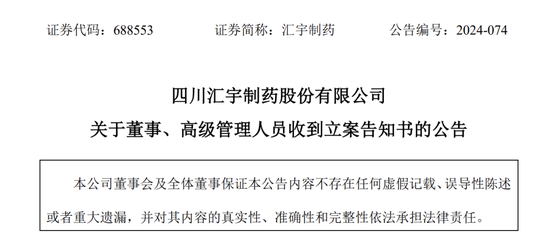 8月6日,汇宇制药公告称,公司董事长、总经理丁兆近日收到《中国证券监督管理委员会立案告知书》(简称“立案告知书”),因其涉嫌短线交易汇宇制药股票,证监会决定对其立案。