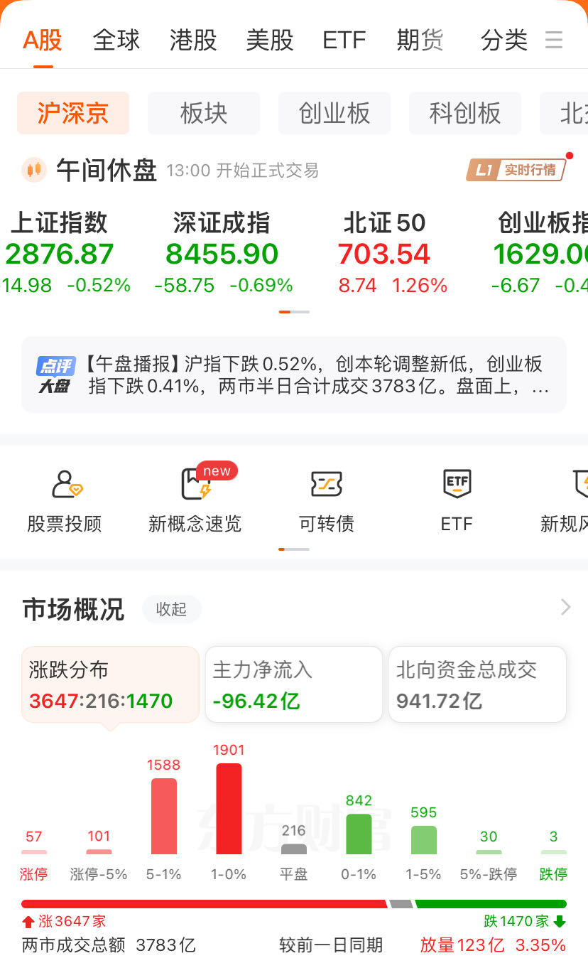今天上午,市场继续震荡调整,三大指数均小幅下跌。截至上午收盘,沪指跌0.52%,深成指跌0.69%,创业板指跌0.41%。总体上个股涨多跌少,全市场超3600只个股上涨。沪深两市半日成交额3783亿元,与上个交易日放量122亿元。