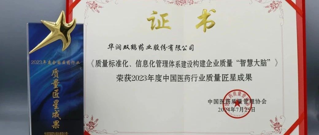 华润双鹤荣获2023年度全国医药行业质量匠星成果奖