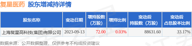 9月13日复星医药发布公告,其股东增持72万股