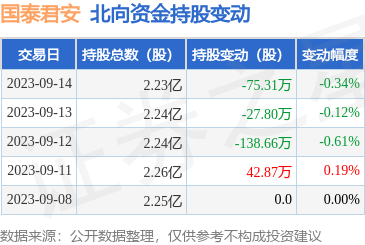 9月14日北向资金减持75.31万股国泰君安。近5个交易日中,获北向资金减持的有3天,累计净减持198.9万股。近20个交易日中,获北向资金减持的有10天,累计净减持602.59万股。截至目前,北向资金持有国泰君安2.23亿股,占公司A股总股本的2.51%。