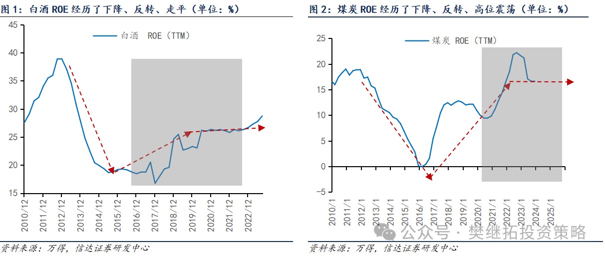 A股历史上能够穿越牛熊,连续3年以上,每年都产生明显超额收益的板块不多。上一次是以白酒为代表的消费核心资产,当下正在演绎这种表现强度的是以煤炭为代表的上游周期。虽然基本面的原因不同,但如果以ROE的结果来看,16-21年白酒和20年至今的煤炭都出现了“ROE先反转+后维持高位”的情况。