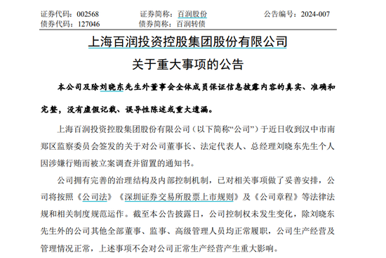 2月27日,百润股份发布公告称,公司于近日收到汉中市南郑区监察委员会签发的关于对公司董事长、法定代表人、总经理刘晓东个人因涉嫌行贿而被立案调查并留置的通知书。