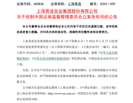 2月27日,上海易连发布公告称,公司收到中国证监会《立案告知书》(编号:证监立案字0032024013号)。因公司涉嫌信息披露违法违规,根据《中华人民共和国证券法》《中华人民共和国行政处罚法》等法律法规,中国证监会决定对公司立案。