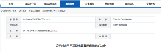 近日,宁波证监局披露了一则《关于对宋甲甲采取出具警示函措施的决定》的公告、