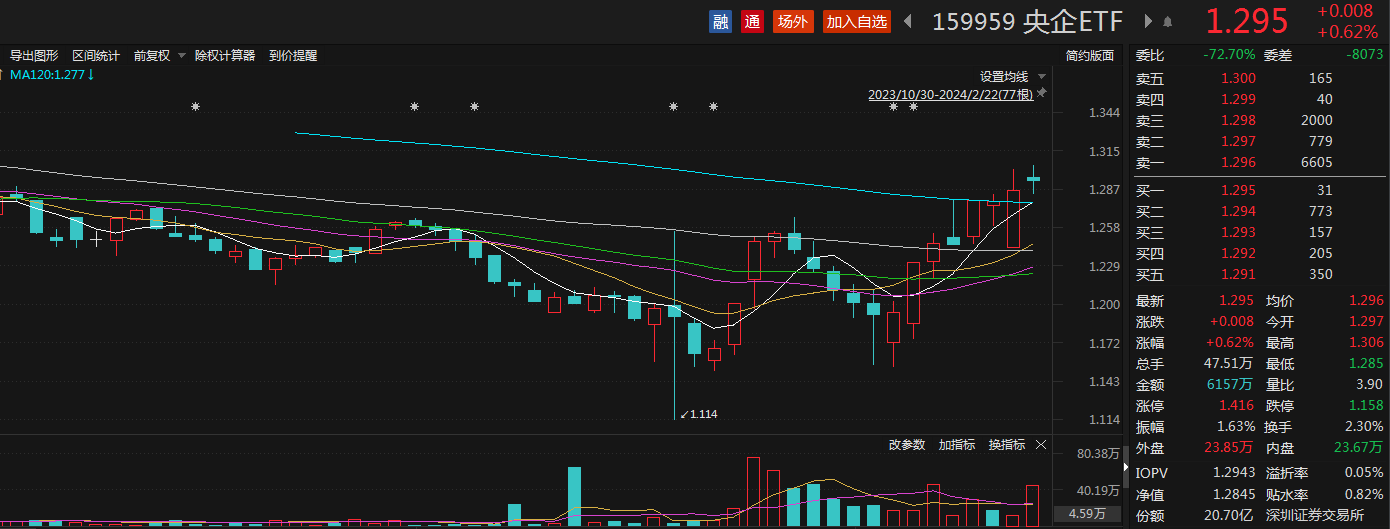 其中央企ETF(159959)放量上涨0.62%,溢折率0.05%,成交额6157万元,而昨日全天成交额仅1583万元。超6成成分股上涨: