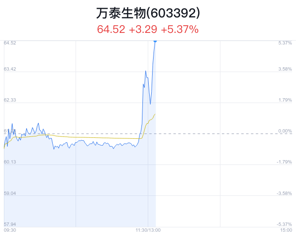 02月22日,万泰生物(603392)股价大幅上涨,截至13点05分,万泰生物上涨5.37%,报64.52元/股,成交5.55亿元,换手率0.71%,振幅6.48%。