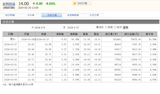 受此利空消息影响,好利科技2月28日股价跌停。2月29日再次下跌,跌幅为-2.21%。